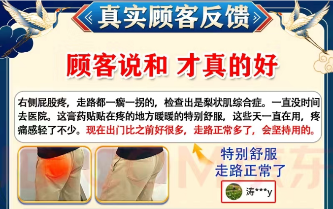 这效果是比较明显的。因为工作原因久坐的时间非常长,又经常加班就患了腰椎病和坐骨神经痛,都好几年了,之间用过很多药都没治好,用了这款正鸿堂治骨膏药到现在快一个半月了,腰椎病彻底好了,贴了三个疗程后就好了后没贴了,到现在都再没有感到疼痛了,也没复发过!真实事例