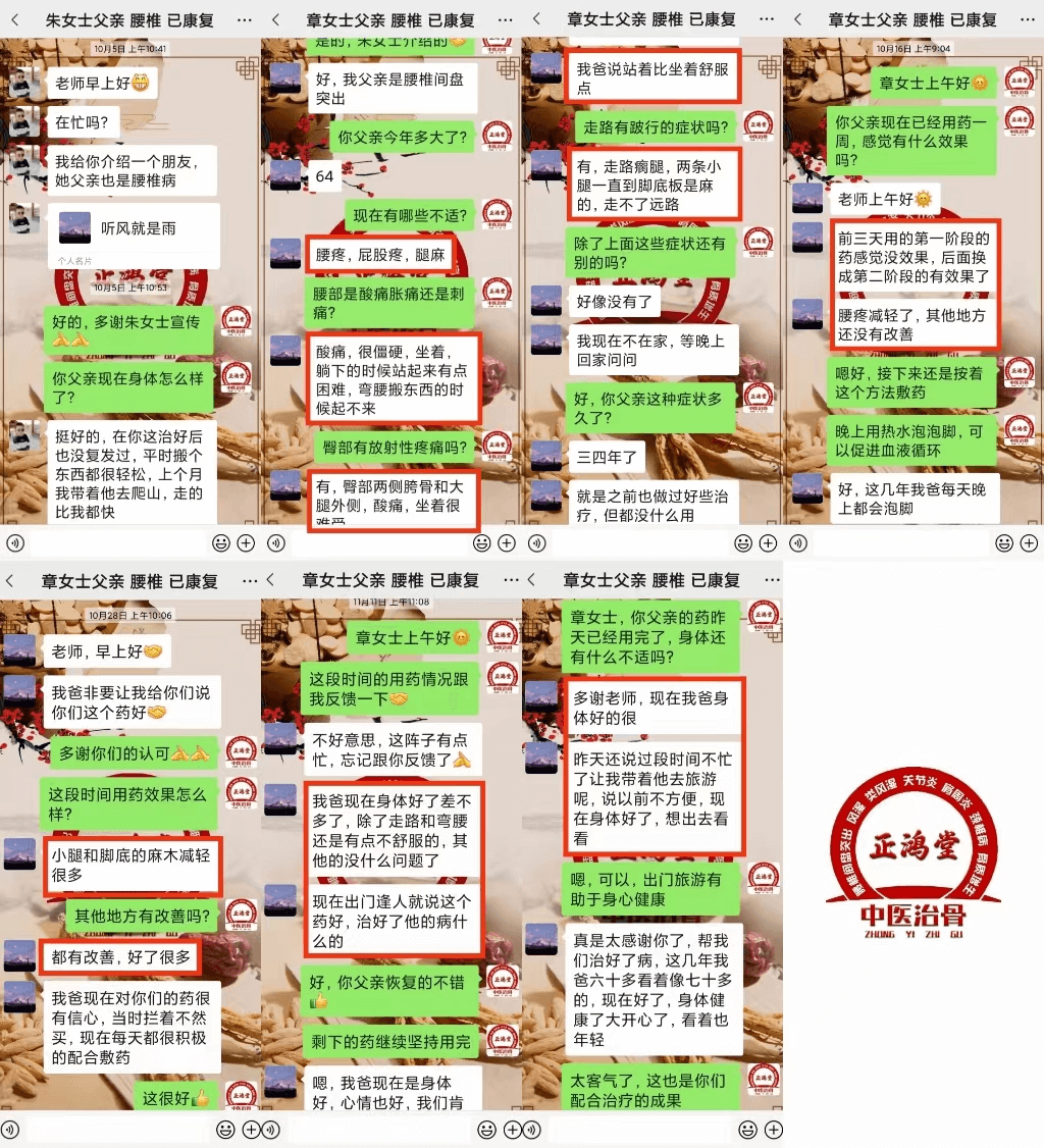 腰间盘突出一直是我们家的阴影,从爷爷、父母到我这个30多岁的年轻人,都遭受着腰疼、屁股疼、走路腿疼、脚趾发麻的痛苦。白天无法久坐办公,生活质量大大降低。看到大家都用正鸿堂治骨治疗效果那么好,我也赶紧试了一下。这种病千万不能拖,我爷爷现在出门比出国还困难,就是因为没有及时治疗拖延导致的。