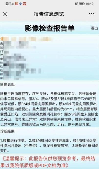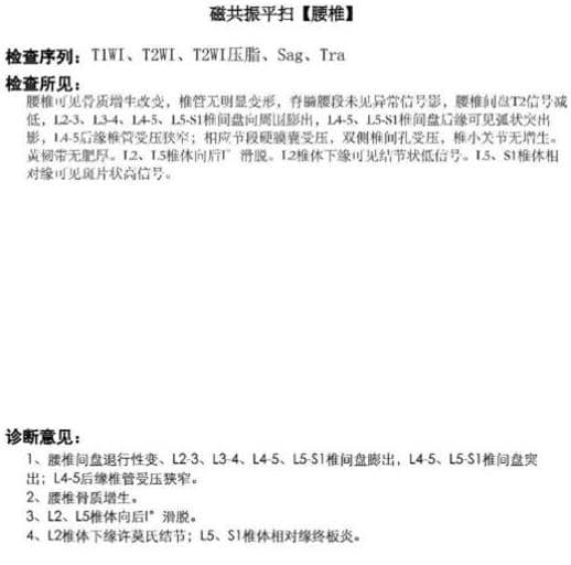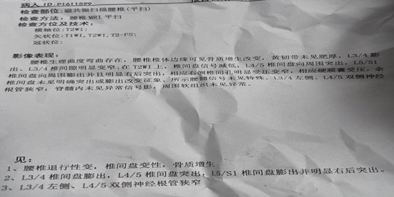 我叫赵鹏举,今年53岁了,我开始的时候是感觉腰椎有点酸,那时候没有怎么在意这个问题,休息下第二天就没事了。随着时间推移慢慢感觉腰椎酸胀疼痛感越来越明显,逐步延续到屁股胯部的位置疼痛,再后来大腿和小腿开始麻木,不听使唤,我还以为我得了中风了,后来去医院拍了片子显示我L3/4椎间盘膨出,L4/5椎间盘突出,L5/S1突出并膨出,L3/4左侧,L4/5双侧,神经根管狭窄。