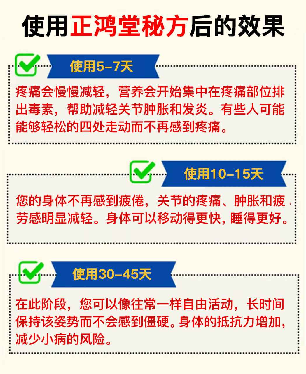 我们这个 正鸿堂治骨是专门针对骨关节问题研制的,成分主要有:杜仲、生川乌、党参、五香血藤、仙鹤草、伸筋草等 57味中药材,引用德国低温超声提取技术和最先进的中药醇提技术,高倍浓缩,通过远红外透皮吸收,穴位局部贴敷,渗透病变组织深部发挥作用,对关节软骨、韧带、肌腱、具有极强的营养修复功能,该方采用穴位贴敷、透皮吸收,消除无菌性炎症,更能营养修复关节软骨、控制椎体退变的迁延、发展和恶化,解除对神经的压迫。专门针对腰椎病顽疾。 顽重症一般七天就能验证出产品效果,三个疗程后停止贴敷症状也不容易再出现。